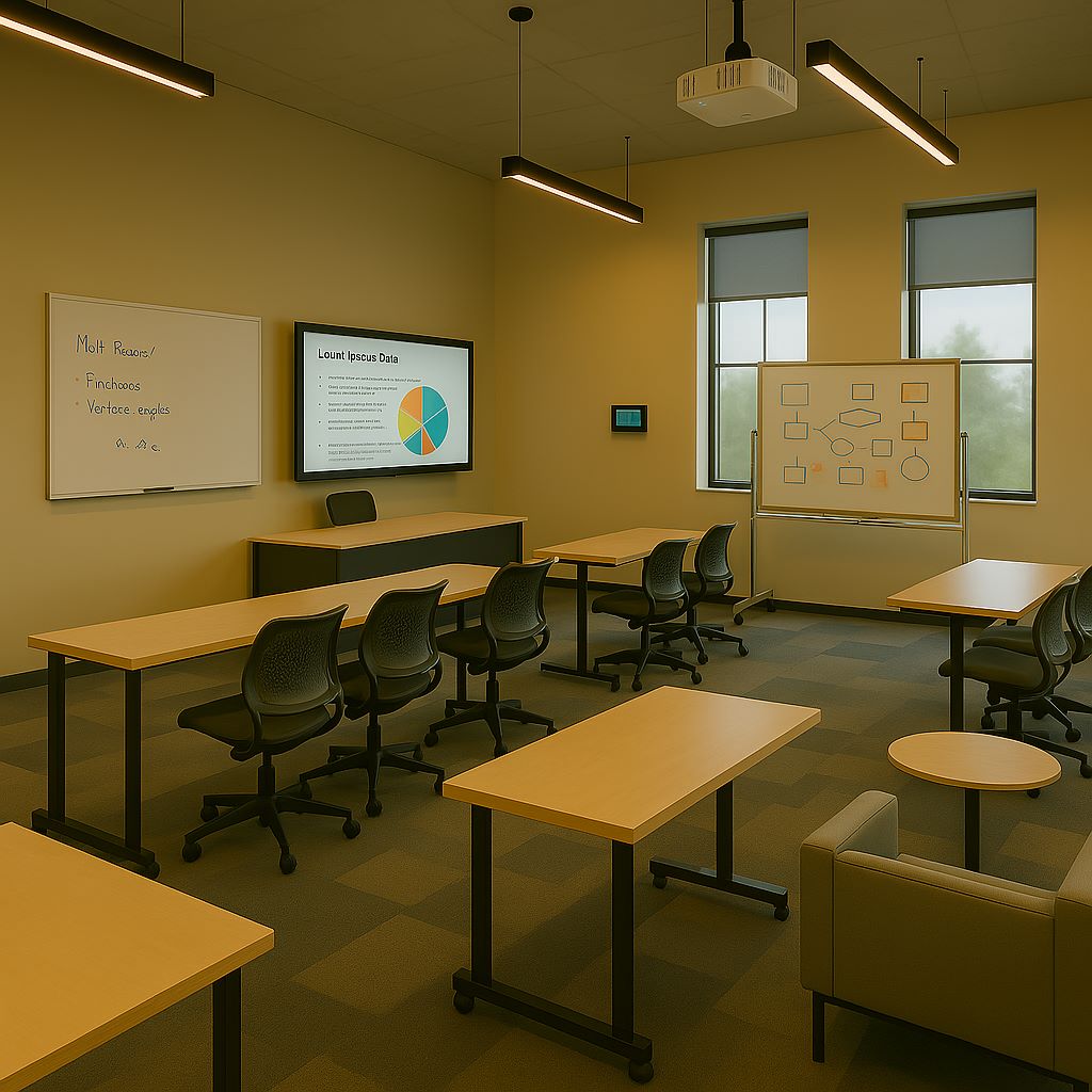 Smart classrooms, computer labs, innovation lab, e-library, work area, coworking area, rest rooms, training, seminar and meeting rooms,etc